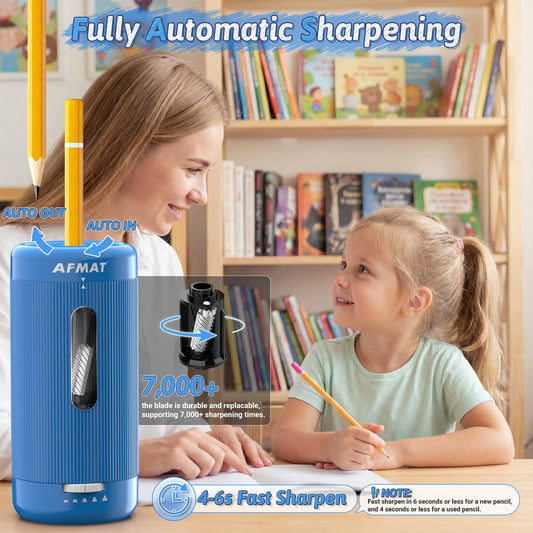 AFMAT PSX5 Fully Automatic Electric Pencil Sharpener for Classroom, 7-11.5mm Colored/Jumbo Pencils, Auto in & Out, Rechargeable Hands-Free Sharpener for Home Office,Blue