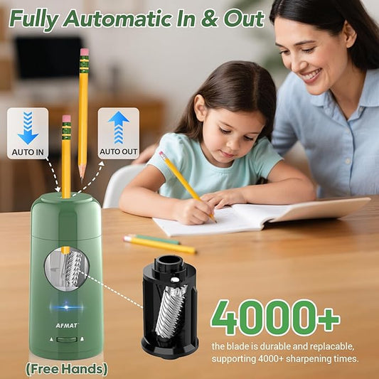AFMAT electric pencil sharpeners are here to save time, frustration, and endless amounts of broken pencil tips. Whether you're creating art in the studio,in the classroom during exam season or at home while using a coloring book, electric pencil sharpeners always come in handy. Have different sizes of pencils? No problem. Need a school's worth of sharpening? Easy! After something small and simple for your desk at the office? Done. We've got an electric pencil sharpener for any job, anywhere.