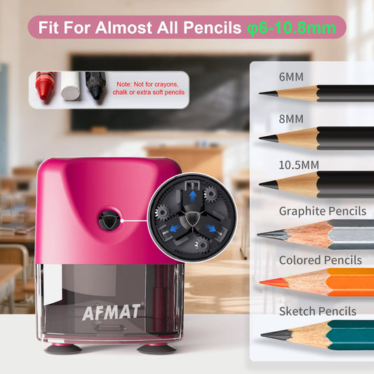 AFMAT electric pencil sharpeners are here to save time, frustration, and endless amounts of broken pencil tips. Whether you're creating art in the studio,in the classroom during exam season or at home while using a coloring book, electric pencil sharpeners always come in handy. Have different sizes of pencils? No problem. Need a school's worth of sharpening? Easy! After something small and simple for your desk at the office? Done. We've got an electric pencil sharpener for any job, anywhere.