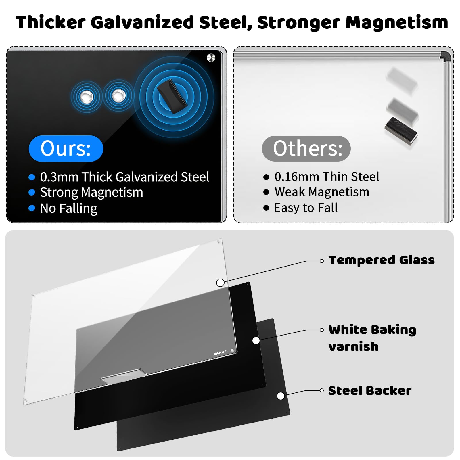 - Strong Magnetic Glass Whiteboard: Say goodbye to weak, sliding magnets! Unlike basic magnetic boards, ours features a 0.3mm galvanized backplate that boosts magnetic strength by up to 50%—securely hold the included eraser, 2 strong magnets (ideal for attaching papers, photos, memos, or project posters), and magnetic marker holder without slips, falls, or mid-use mishaps. Keep your writing tools organized, within arm’s reach, and never misplaced—perfect for offices, classrooms, or home workspace!