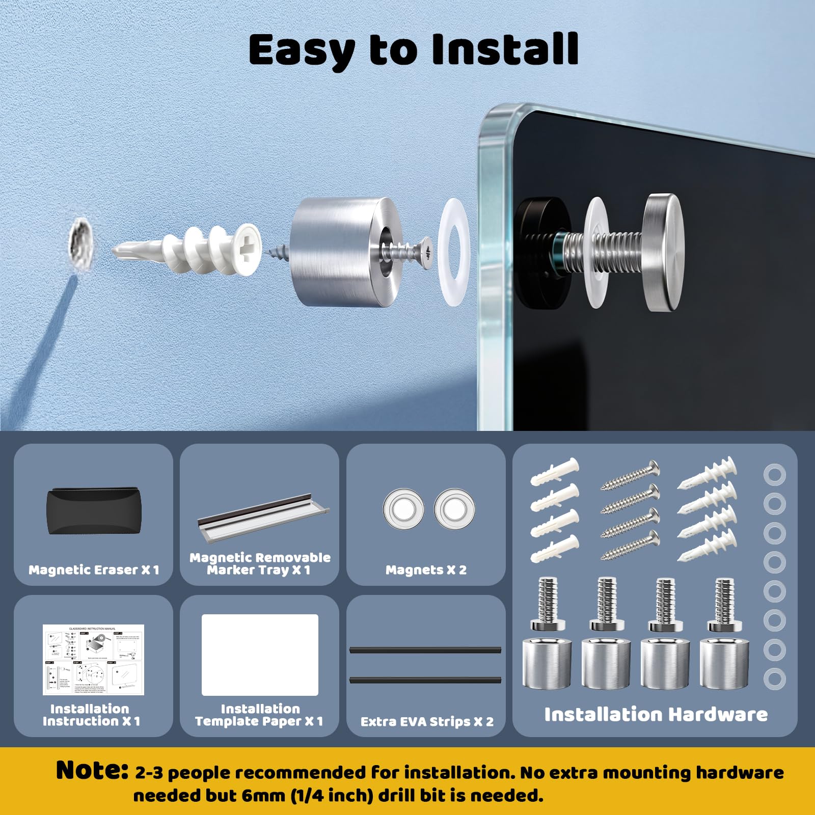 - Stable Writing & Easy to Install: No more wobbly writing! We’ve added 2 thick EVA anti-slip strips to the back of the board, ensuring it stays rock-steady even when you’re writing vigorously—perfect for large board that often sacrifice stability for size. You’ll get: 1 glass board, 1 eraser, 1 magnetic marker tray, 1 paper template, 2 strong magnets, and installation hardware. Pro tips: Two or three people are recommended for safe installation; a 6mm (1/4”) drill bit is required (not included).