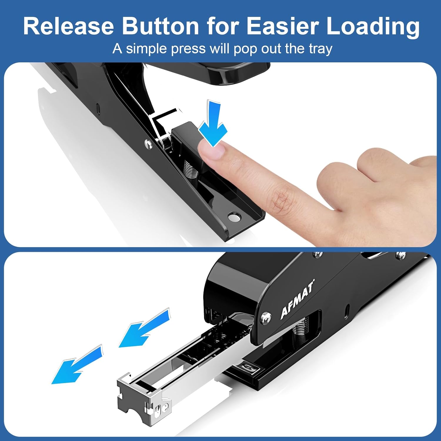 - ✅AUSLÖSETASTE FÜR SCHNELLES LADEN: Die Auslösetaste macht das Nachfüllen zum Kinderspiel: Drücken Sie die Taste auf der Rückseite der Heftzange, und das Magazin springt zum schnellen Nachladen heraus. Das spart Mühe und steigert die Effizienz in einem hektischen Büro. Geeignete Klammertypen: #26/6 Standardklammern (mit 1/4" langem Schenkel) für 20-25 Blatt, #24/8 Klammern (mit 5/16" langem Schenkel) für 30 Blatt. (#26/6 Standardklammern nicht im Lieferumfang enthalten, #24/8 Klammern im Lieferumfang enthalten)
