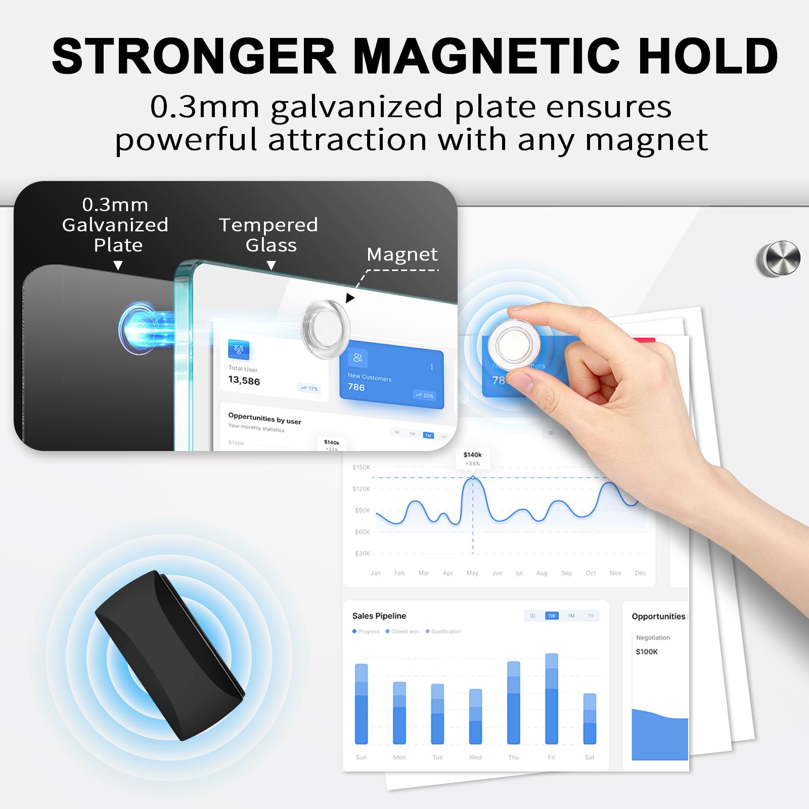 - Enhanced Magnetic Whiteboard with Stronger Hold: Unlike ordinary magnetic boards, our glass whiteboard integrates a 0.3mm galvanized back plate, significantly boosting magnetic strength. Therefore, the included eraser, magnets(for attaching papers, photos, memos, or posters to the board), magnetic marker holder all can secure to the board, won’t slide or fall mid-use. Keeping your tools organized, instantly accessible, and never lost.