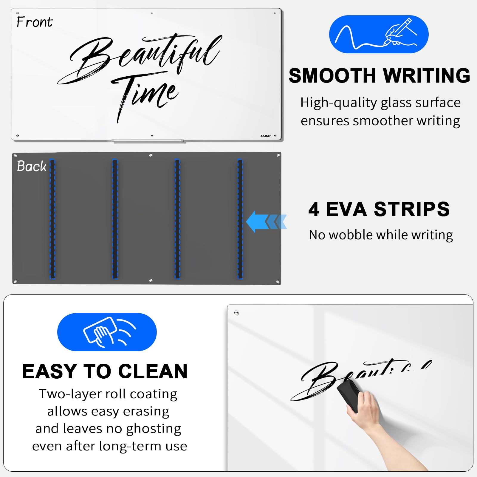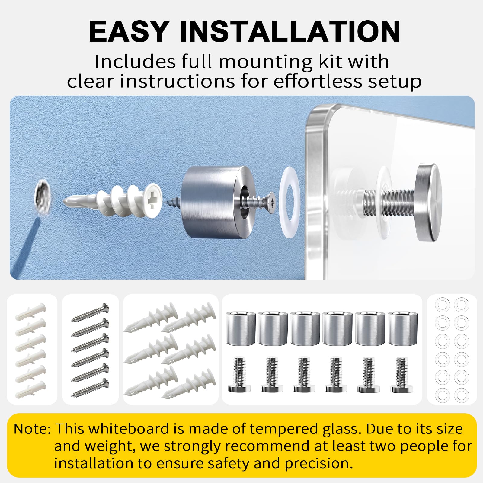 - Complete Kit for Stable Writing & Easy Installation: Tired of annoying wobbles when writing on large glass whiteboards? Unlike ordinary glass boards that sacrifice stability for size, ours combines spacious writing area with unbeatable steadiness - 4 EVA strips mounted on the back of the dry erase board ensure no more wobbling while writing. Installation of this magnetic glass whiteboard is a breeze with our complete accessory kit and user-friendly design. Warm tips: Due to it being large and heavy, 2 or more people cooperation is recommended; 6mm (1/4”) drill bit needed (not included).