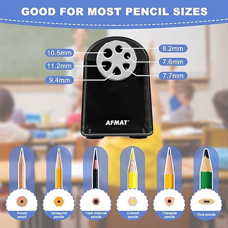 - This 6-hole electric pencil sharpener fits almost all standard and jumbo pencils varying in size(withiφ11.2mm) and shape(round, triangular, hexagonal, etc), and gives a sharp, even, smooth pencil point each time.