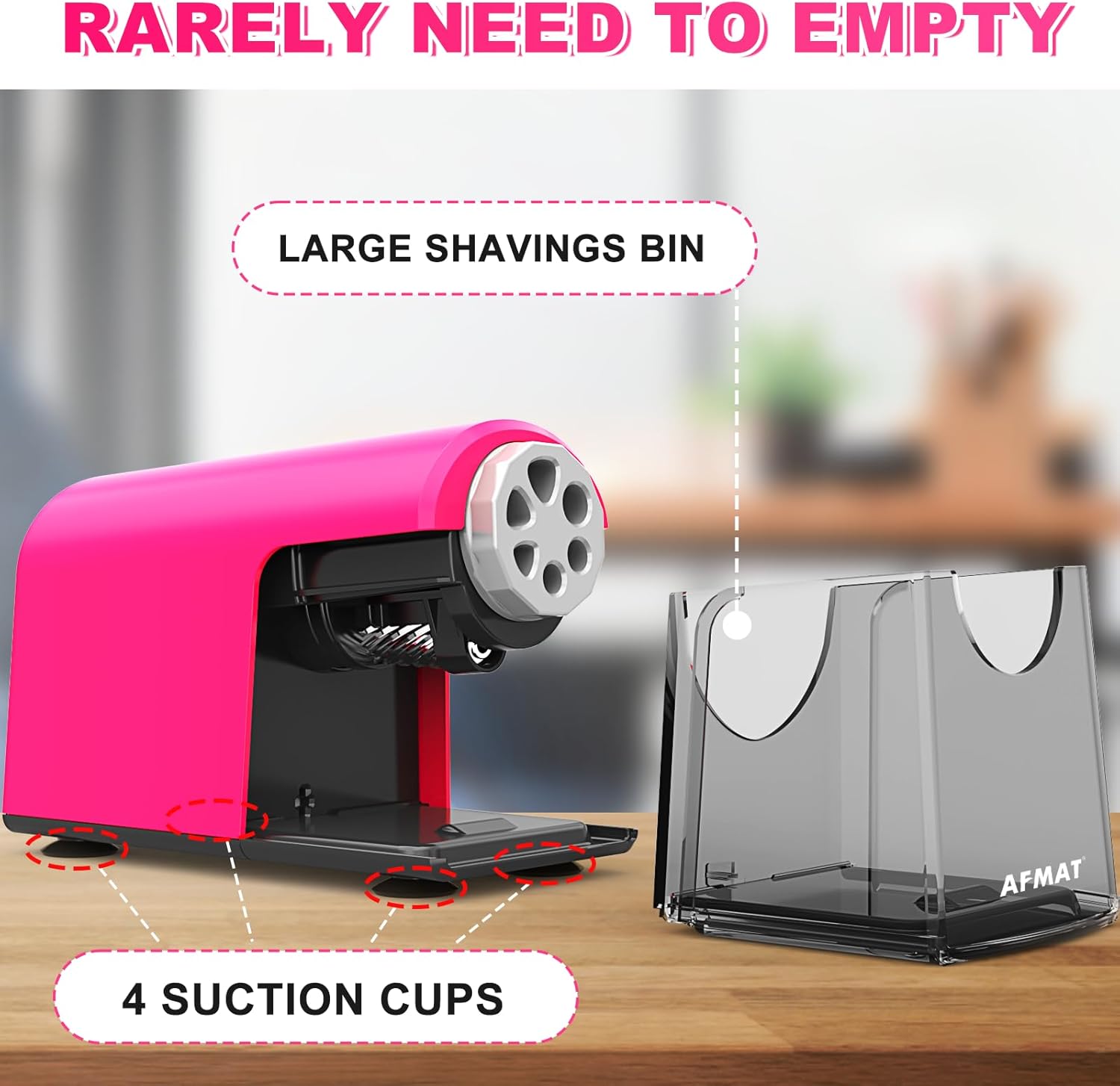 - This pencil sharpener has a larger and see-through shavings bin which rarely needs to clean. The 4 suction cups at the bottom are strong enough to hold this pencil sharpener in place.