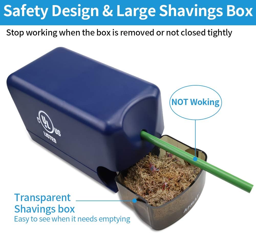 - Commercial Pencil Sharpener: High efficiency, fast speed and heavy use make it an industrial and commercial pencil sharpener. It has two safety features. The pencil sharpener will stop working when the shavings box is removed or not closed tightly. When sharpening too many pencils at a time, it will overheat and stop sharpening. Non-skid food pads at the bottom make it more stable to sharpen.