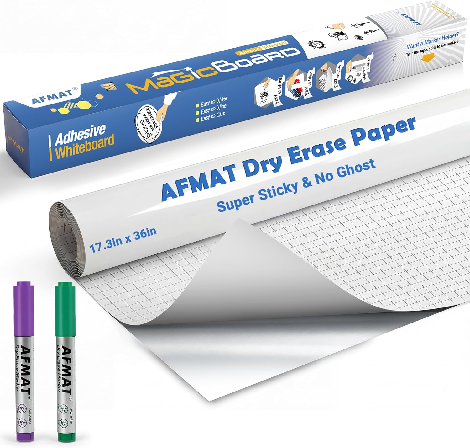 AFMAT White Board Dry Erase Paper, 36" x 17.3" Whiteboard Wallpaper, with 2 Markers, Stain-Proof & Super Sticky, No Ghost After 60 Days, Peel and Stick Dry Erase Board Paper Roll for Wall/Home/Office