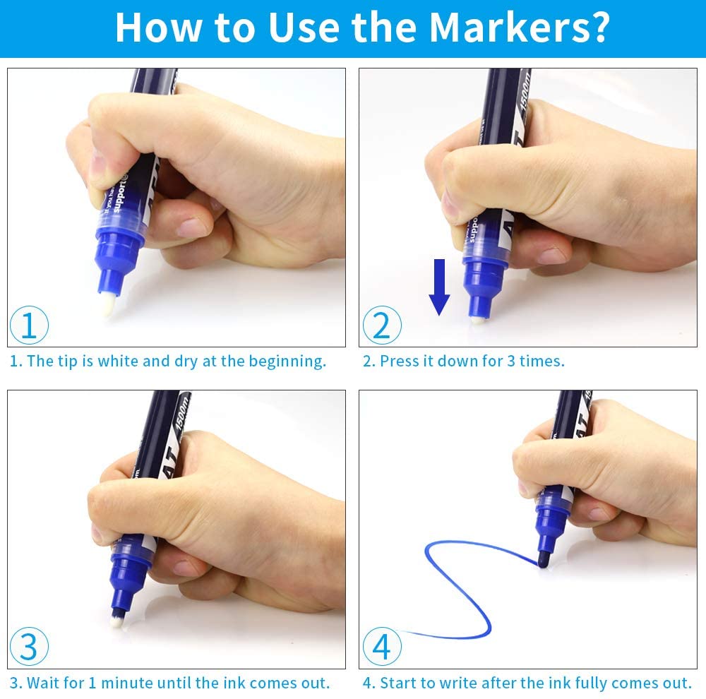 - Pour utiliser les marqueurs pour la première fois, veuillez appuyer sur la pointe 2 à 3 fois et attendre 2 minutes jusqu'à ce que l'encre sorte.