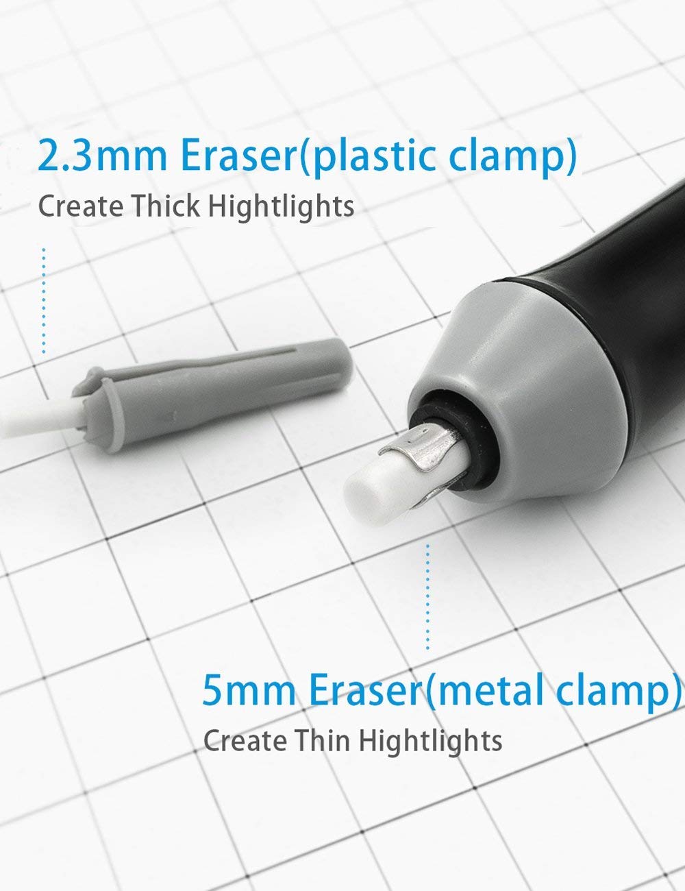 - Nouveau design avec deux tailles de gomme : notre gomme électrique comprend deux porte-gommes pour les tailles φ2,3 mm et φ5 mm. Utilisez le plus grand pour créer des reflets épais et le plus petit pour effacer les petites zones comme les cheveux. Idéal pour les artistes et les professionnels.