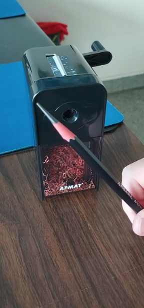 Il est super facile à utiliser, il suffit d'insérer le crayon dans le support et de tourner dans le sens des aiguilles d'une montre tout en tenant le taille-crayon, le crayon commence à se déplacer à l'intérieur du taille-crayon à chaque manivelle ; lorsque la résistance diminue, tournez-le dans le sens inverse des aiguilles d'une montre et le crayon commence à sortir tout seul !