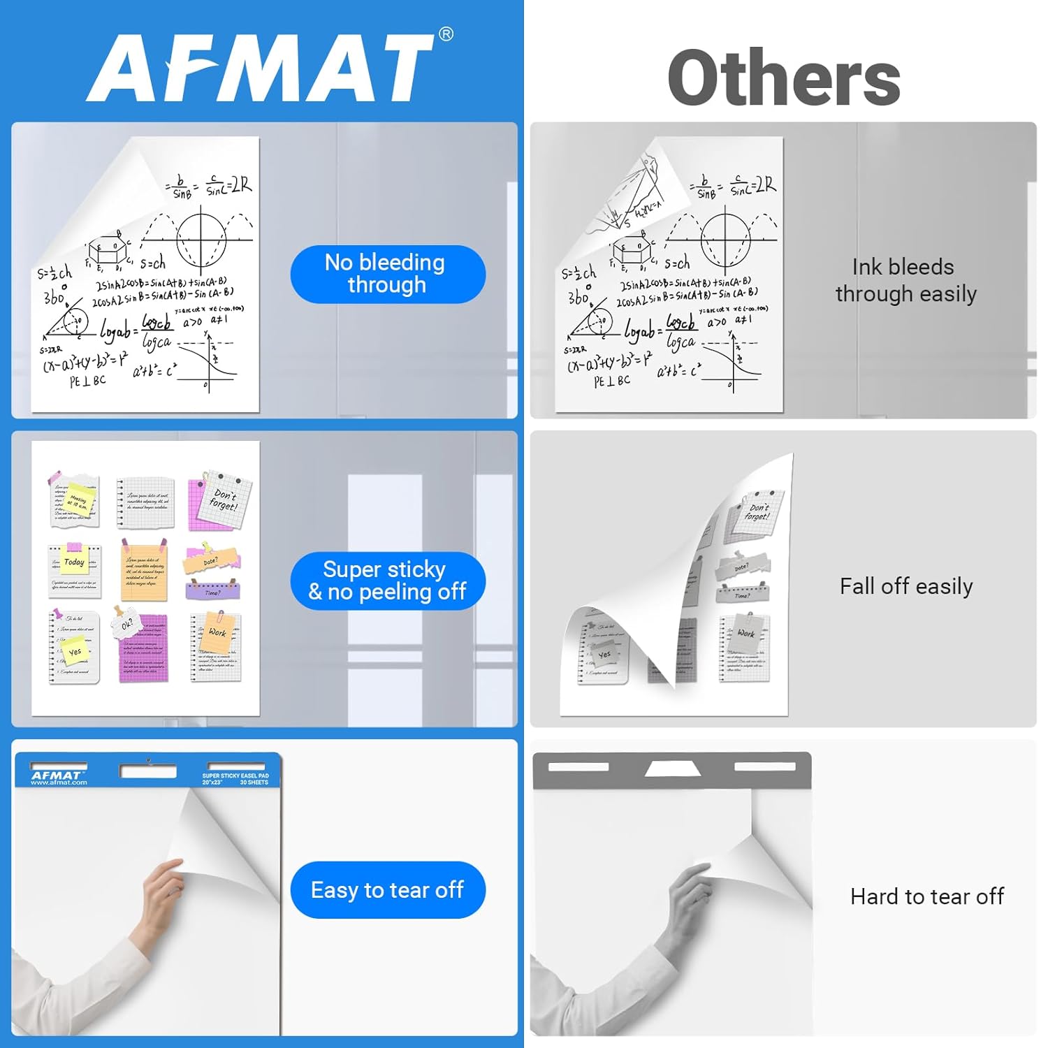 - INK BLEED-THROUGH RESISTANT - Each AFMAT sticky easel pad comes with 30 sheets of premium paper that effectively resists ink bleed-through from markers, pens, and other writing tools, keeping your notes and ideas clean and legible on the page, not on what's under the page. (Note: It typically takes 3-4 seconds for ink to dry completely. To avoid smudging, please refrain from touching the freshly written content immediately after writing.)