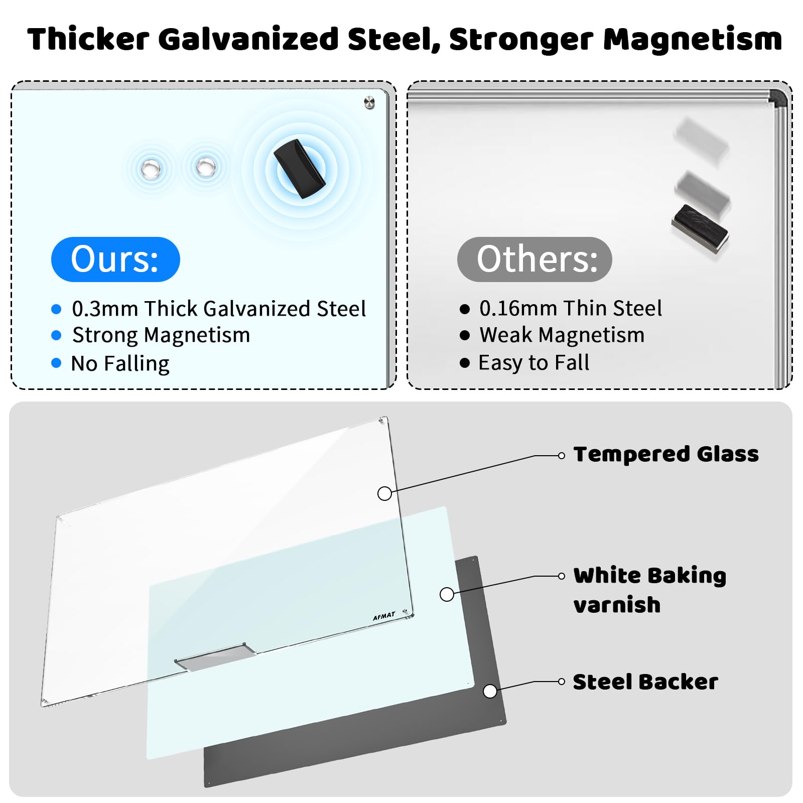 - Strong Magnetic Glass Whiteboard: Say goodbye to weak, sliding magnets! Unlike basic magnetic boards, ours features a 0.3mm galvanized backplate that boosts magnetic strength by up to 50%—securely hold the included eraser, 2 strong magnets (ideal for attaching papers, photos, memos, or project posters), and magnetic marker holder without slips, falls, or mid-use mishaps. Keep your writing tools organized, within arm’s reach, and never misplaced—perfect for offices, classrooms, or home workspace!