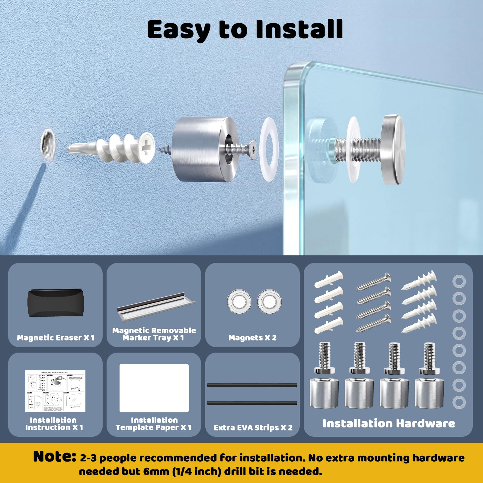 - Stable Writing & Easy to Install: No more wobbly writing! We’ve added 2 thick EVA anti-slip strips to the back of the board, ensuring it stays rock-steady even when you’re writing vigorously—perfect for large board that often sacrifice stability for size. You’ll get: 1 glass board, 1 eraser, 1 magnetic marker tray, 1 paper template, 2 strong magnets, and installation hardware. Pro tips: Two or three people are recommended for safe installation; a 6mm (1/4”) drill bit is required (not included).