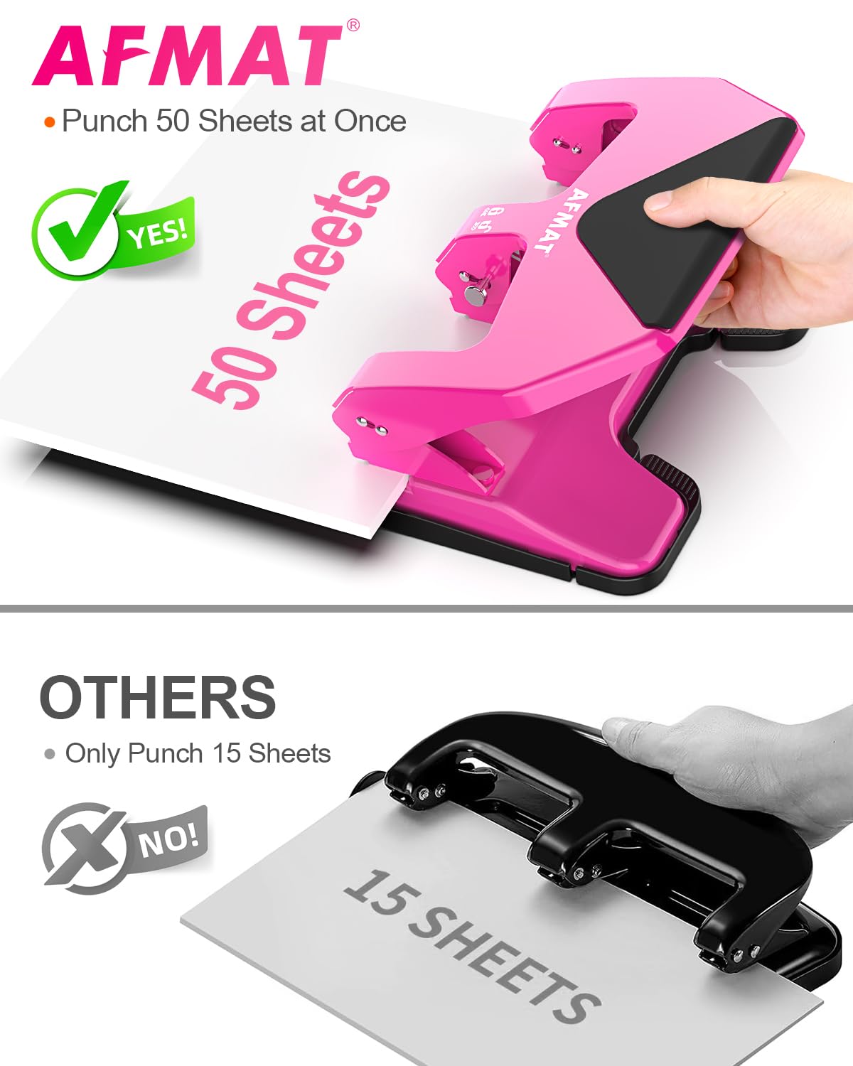 - Punch 50 Sheets at Once: This heavy duty three hole punch can punch through 50 sheets of 21lb (80gsm) paper at ease and leaves no hanging "chads", which saves time and boosts your work efficiency. The whole operation is fast and silent, perfect for teachers, office workers, and anyone who frequently handles paperwork.