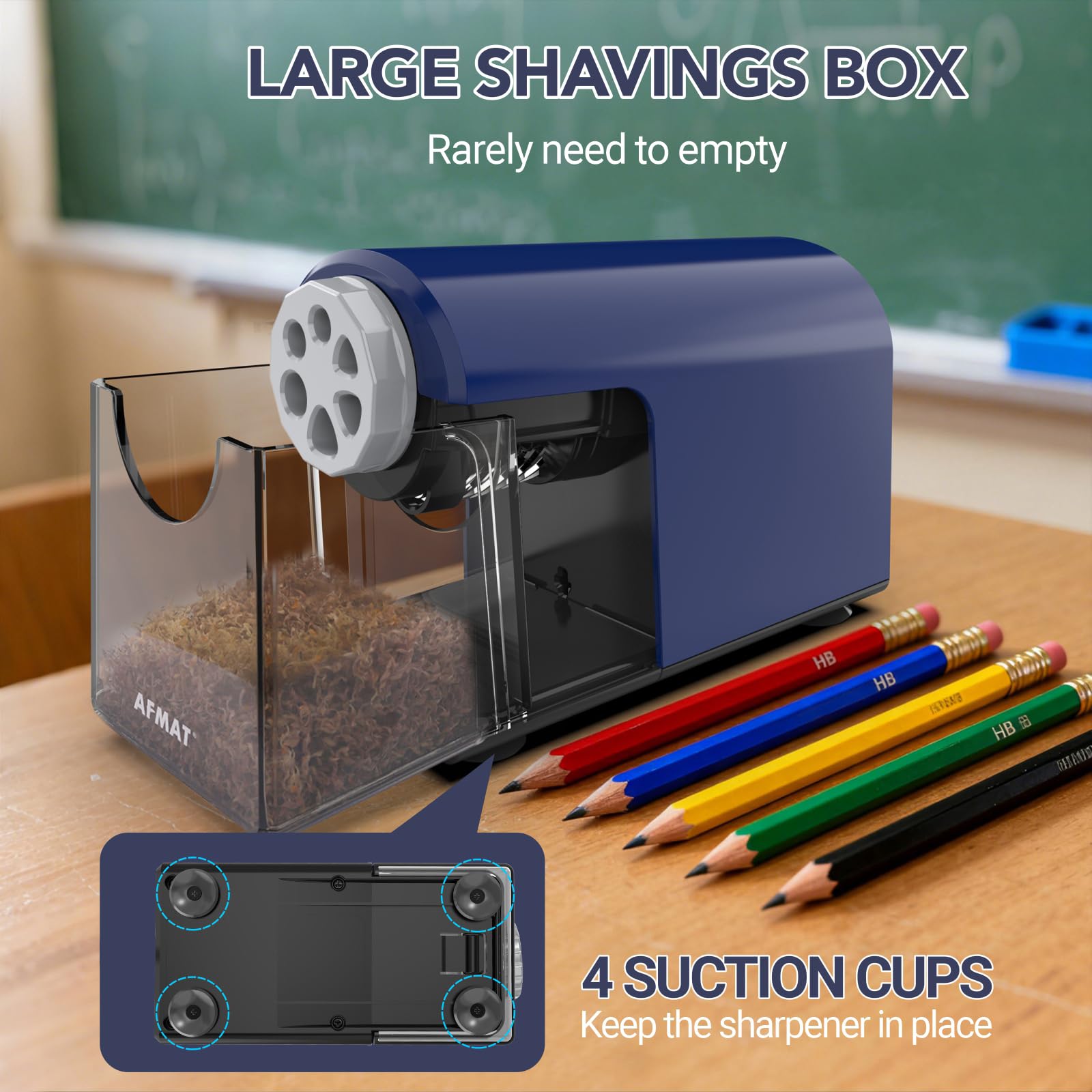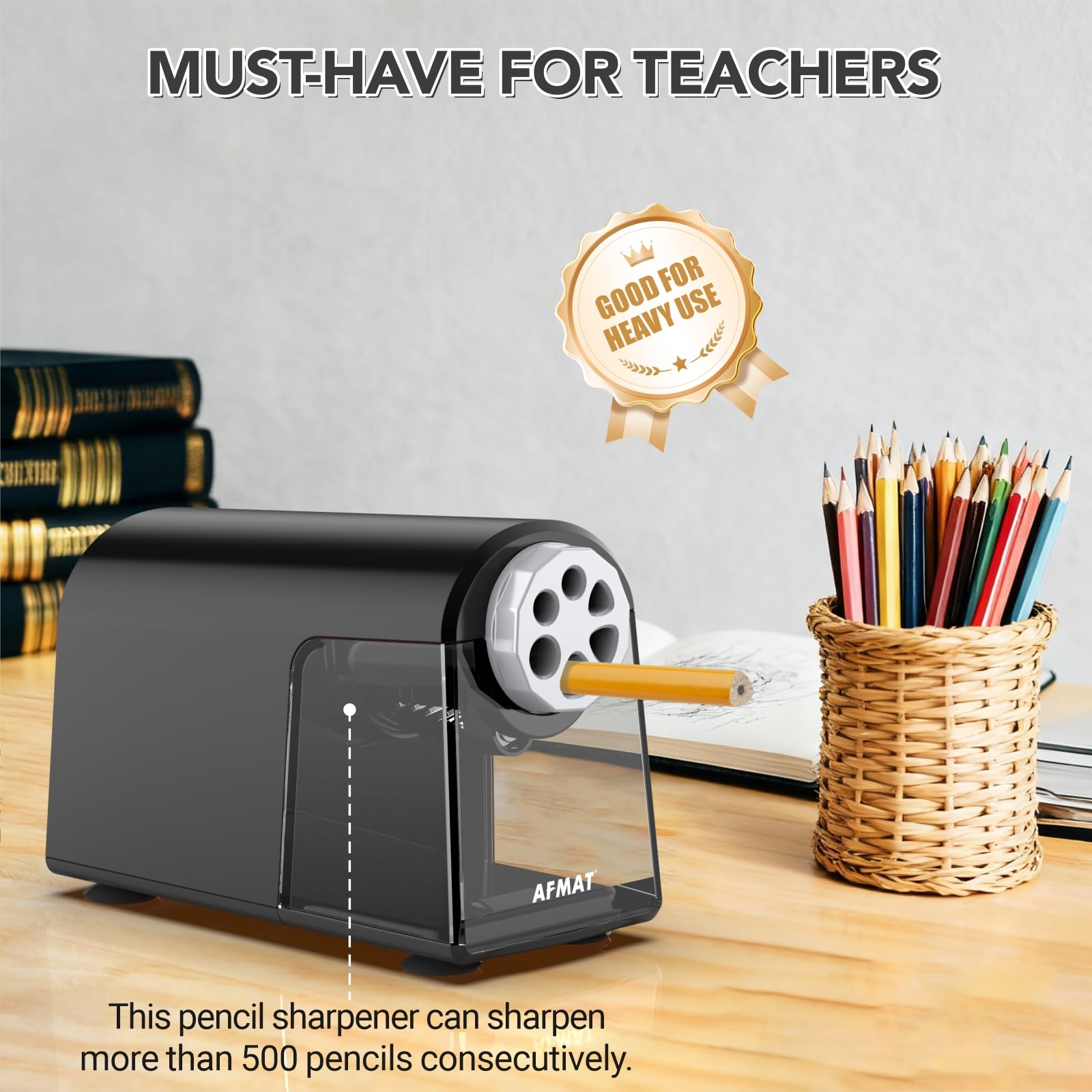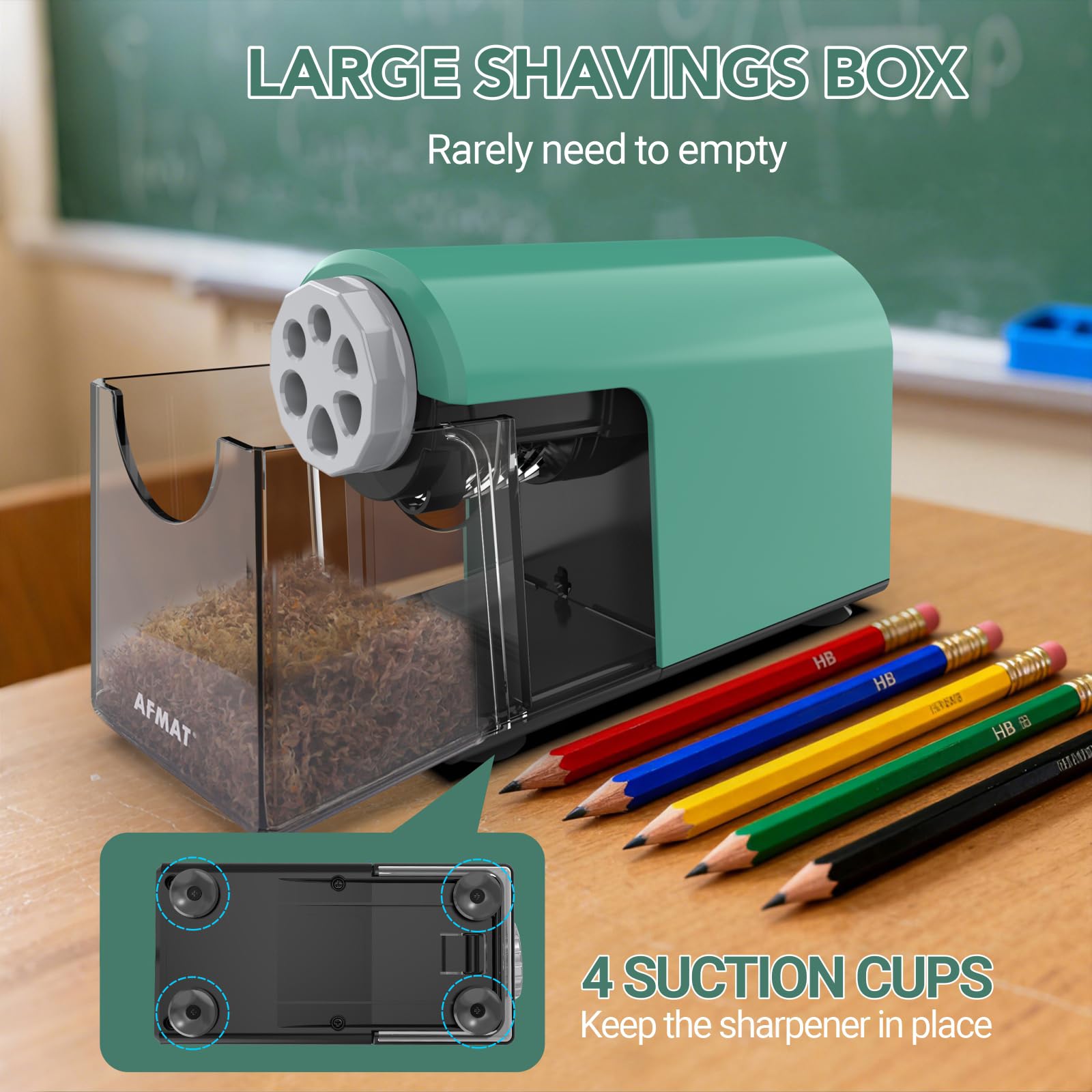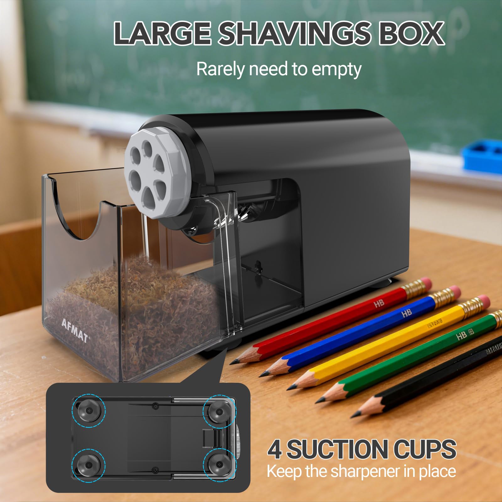 - 【Classroom Pencil Sharpener: Fast Sharpen in 3S & SAVE PENCILS】AFMAT classroom pencil sharpener sharpens pencil incredibly fast(Less than 4s for new and 2s for used) and to a fine point w/o. breaking the tips, which makes it a teacher’s dream sharpener for its speed, efficiency, and breakage-free feature. It will auto stop once pointy keeps every pencil from being over sharpened and shave wood off as little as possible so it doesn’t wear down the pencil like most being electric.