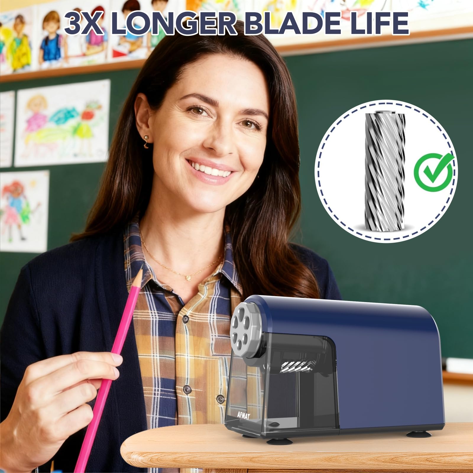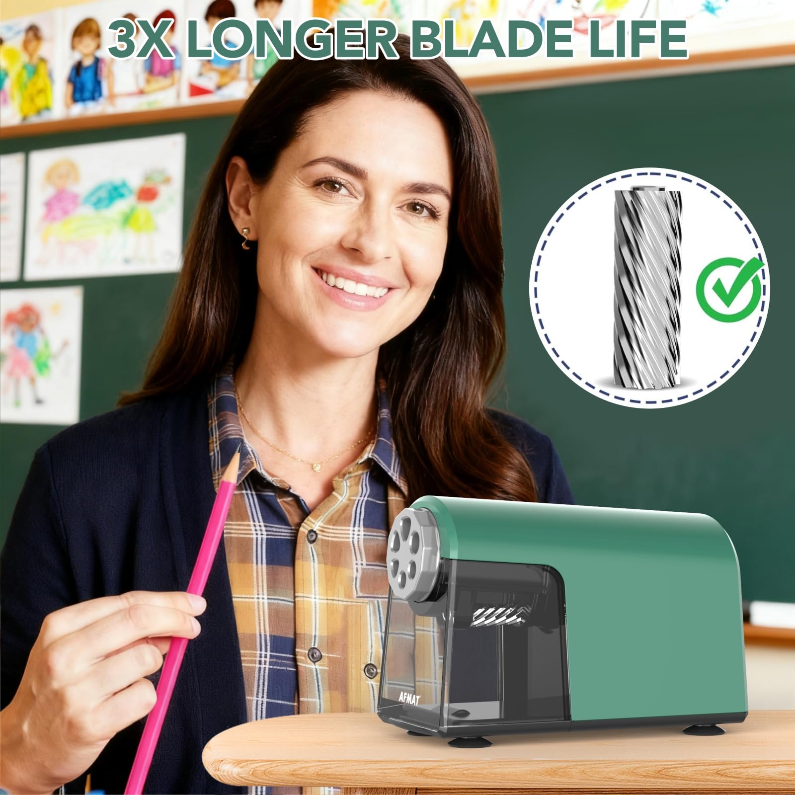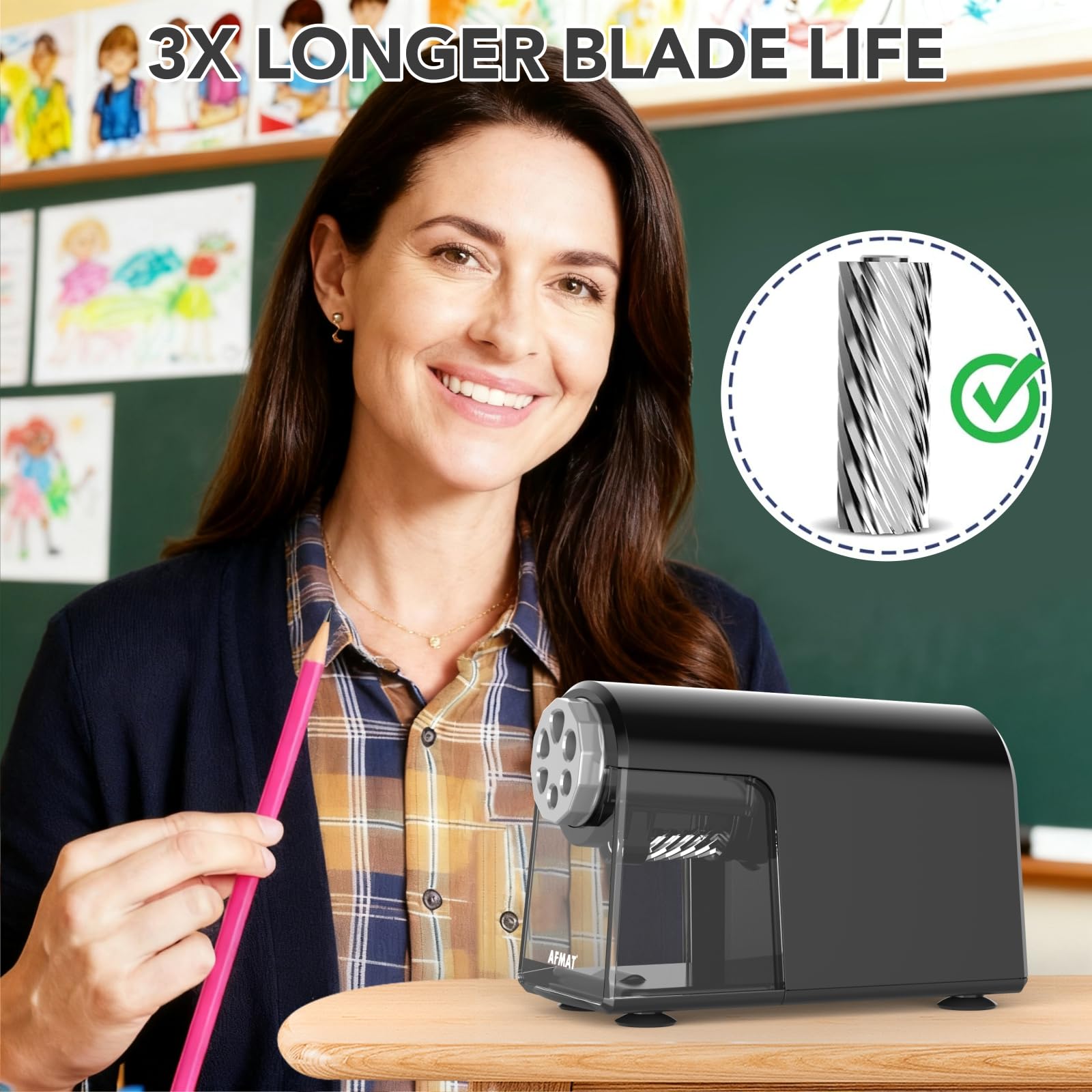 - 【Classroom Pencil Sharpener: Fast Sharpen in 3S & SAVE PENCILS】AFMAT classroom pencil sharpener sharpens pencil incredibly fast(Less than 4s for new and 2s for used) and to a fine point w/o. breaking the tips, which makes it a teacher’s dream sharpener for its speed, efficiency, and breakage-free feature. It will auto stop once pointy keeps every pencil from being over sharpened and shave wood off as little as possible so it doesn’t wear down the pencil like most being electric.