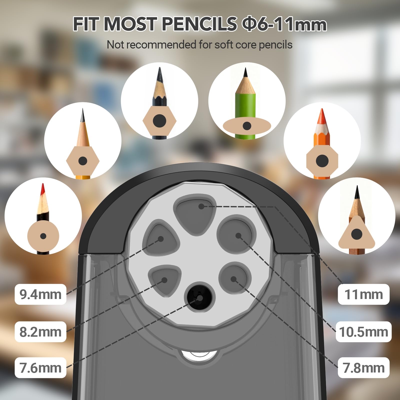 - 【6-Hole Pencils Sharpener: For Skinny & Jumbo Pencils】The 6 pencil holes of this electric pencil sharpener accommodate almost all your pencils varying in size(withiφ11mm) and shape(round, triangular, hexagonal, etc), and keep every pencil inside in such a way as to be snugly fitted in position while sharpening for even cutting. The point this electric sharpener gives on a pencil is sharp, even and also smooth for its integrated auto deburring process at the end of each sharpening cycle.