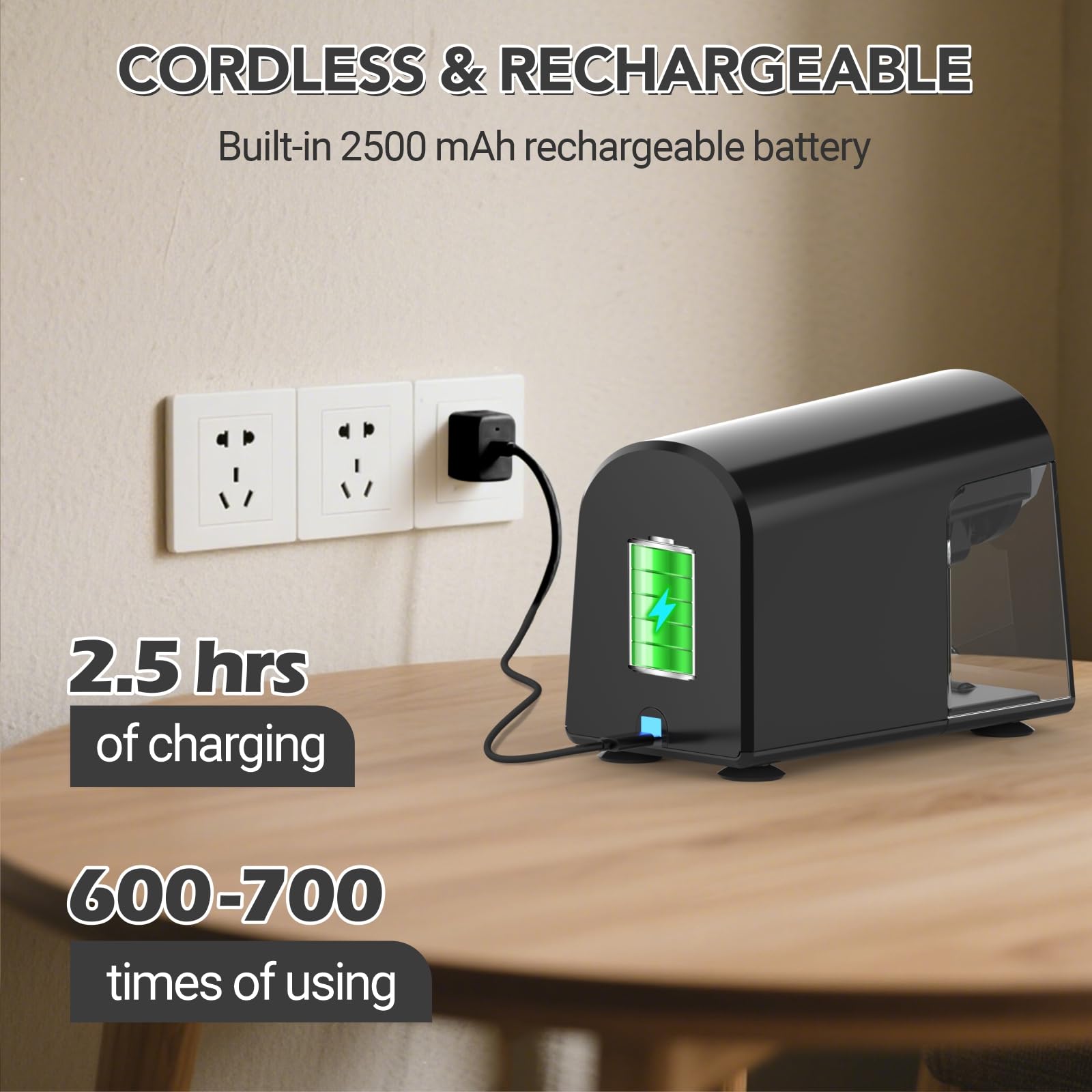 - 【Rechargeable Pencil Sharpener: 600-700 Sharpenings on a Full Charge】With built-in 2500 mAh lithium battery, this pencil sharpener can be recharged and reused, and used anywhere, indoor and outdoor. To charge the sharpener, connect the USB cable to a 5V 2A adapter. (The output should not be over 5V) Thanks to the large battery capacity, it can handle up to 600-700 pencil sharpenings on a full charge. Only takes about 2.5 hours to fully charge, it can meet the usage needs for several weeks.