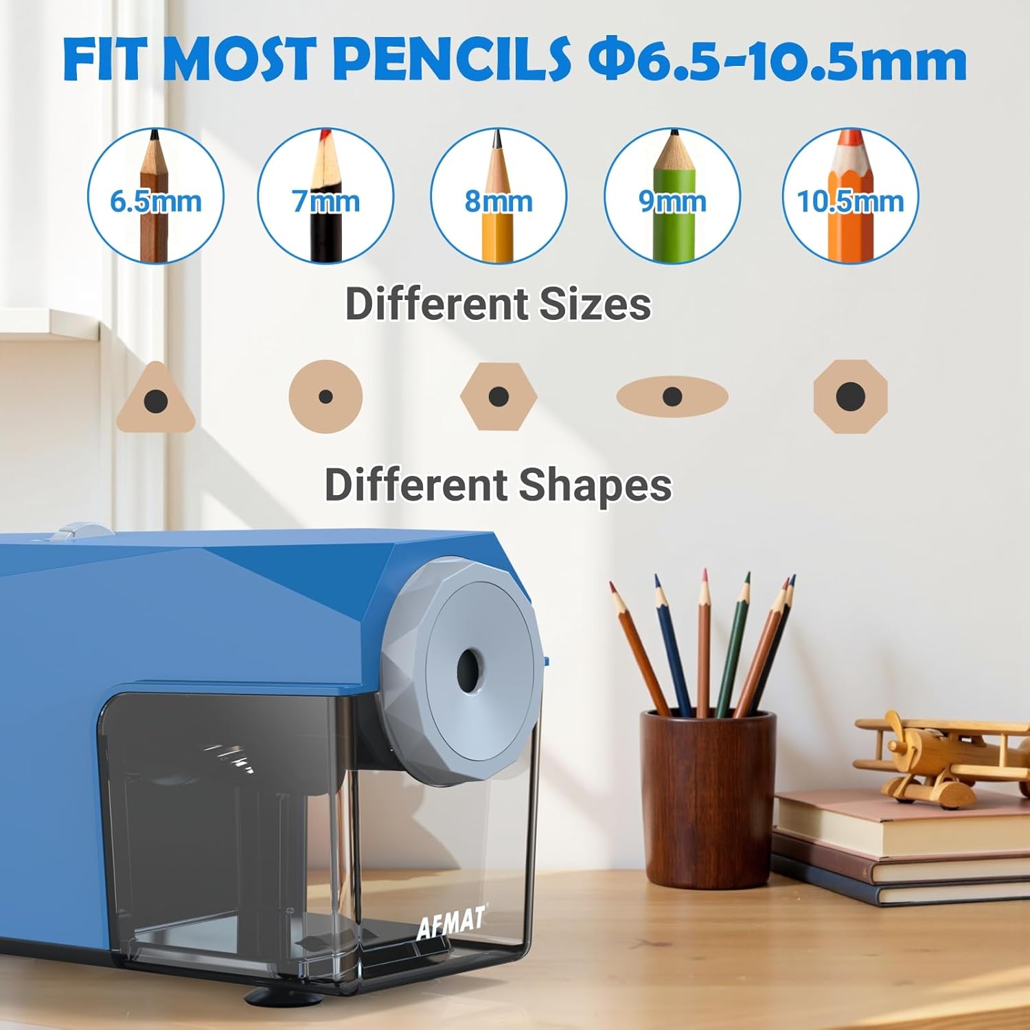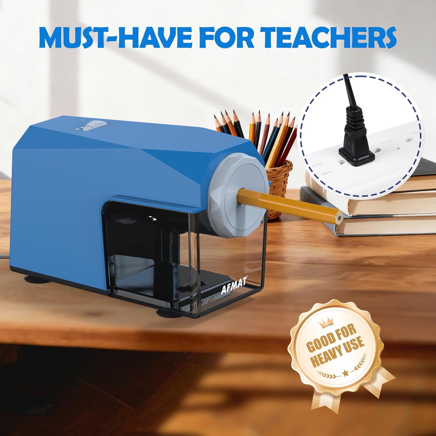 - ✅Classroom Pencil Sharpener - Fast Sharpen in 3S - AFMAT classroom pencil sharpener sharpens pencil incredibly fast(Less than 5s for new and 3s for used) and to a fine/blunt point w/o. breaking the tips, which makes it a teacher’s dream sharpener for its speed, efficiency, and breakage-free feature. It will auto stop and eject the pencil once pointy keeps every pencil from being over sharpened and shave wood off as little as possible so it doesn’t wear down the pencil like most being electric.