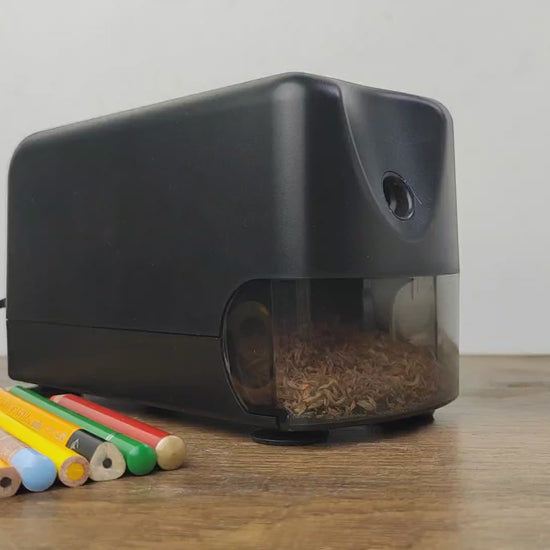 - This pencil sharpener is super easy to use. Just plug it into a 120V wall outlet. Perfect for school, home and office. Note: If the shavings box is not installed in place, the pencil sharpener will not work for safety concern.
