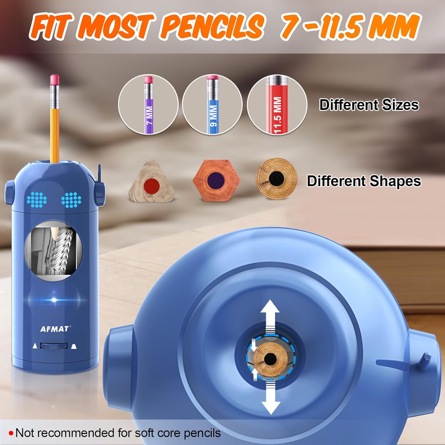 - FULLY AUTOMATIC PENCIL SHARPENER: Simply drop a pencil in and this electric pencil sharpener will auto feed in and auto eject the pencil once pointy. This is the best pick of the back-to-school style sharpeners. This robot pencil sharpener is really a no-touch, which ensures kid' hands’ safety and avoids hand pain.